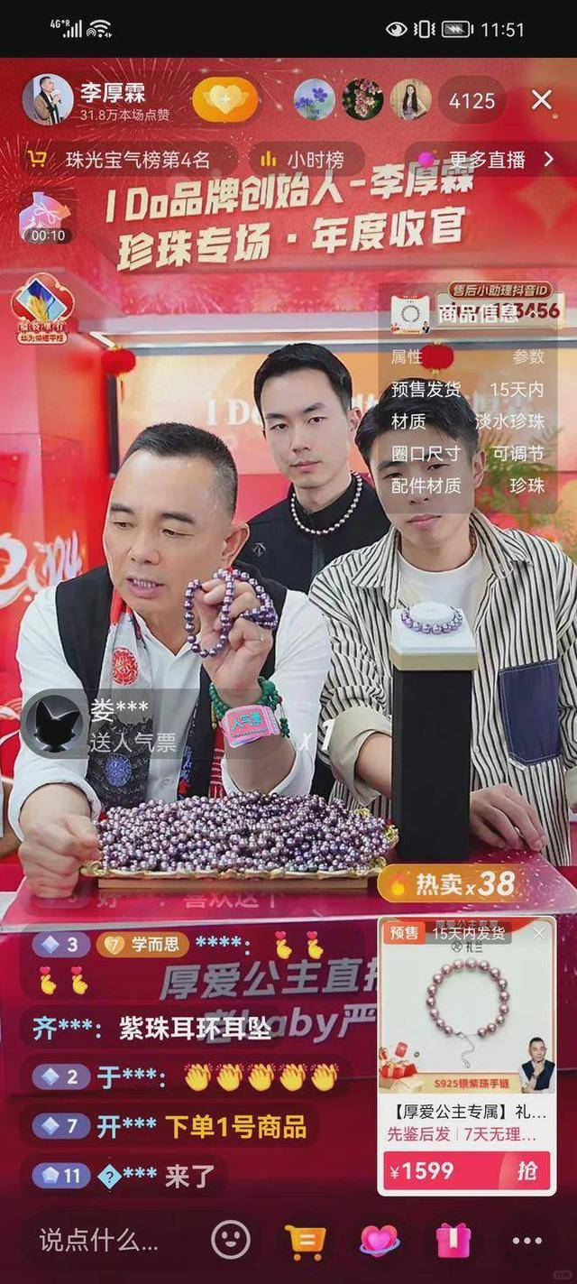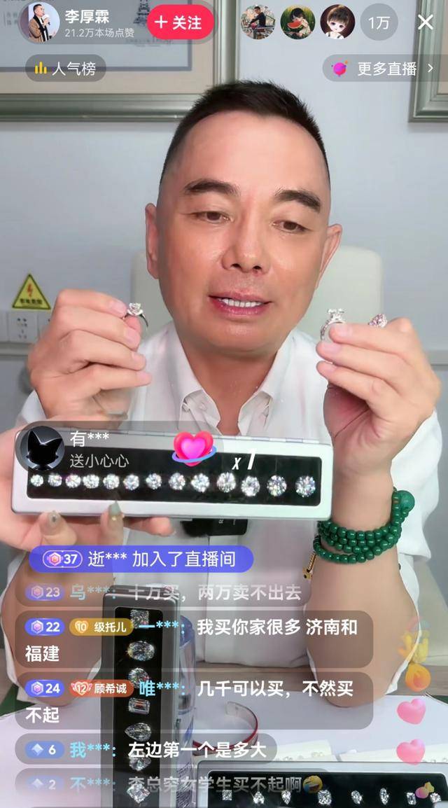 李厚霖坐在直播间,灯光暗淡,录像头前摆着几件珠宝,屏幕上的弹幕马上滚动。