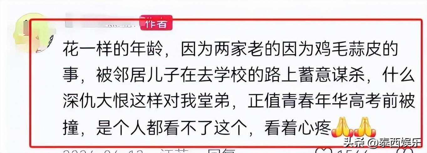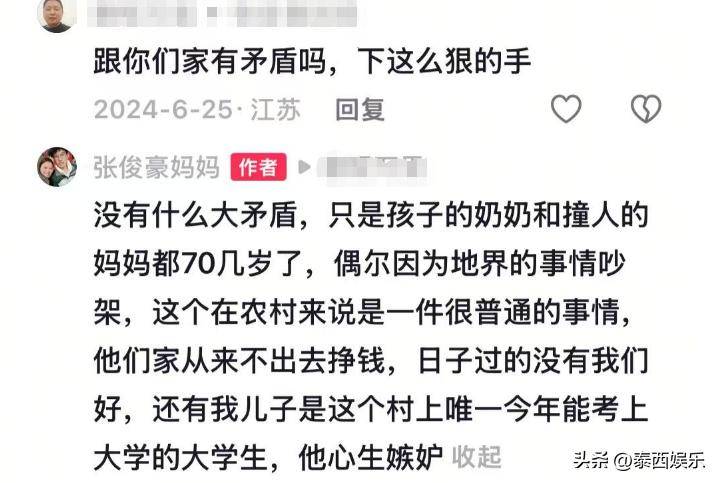 网友们酸心的同期,也对事件背后的原因暗示兴趣,念念知谈张俊豪家和邻居家的矛盾 究竟有多严重,才会让闹事者给与在高考前夜开车撞东谈主? 皇冠滚球原因曝光、太可恶! ![]() 跟着事件的发酵,更多对于这起事故的内幕被曝光了出来。 据知情东谈主士流露,张俊豪的爷爷奶奶和邻居家的老东谈主之间也曾有过矛盾, 主如果因为屋基地的地界问题。