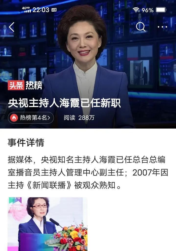 如今的海霞也启动了幕后的责任,她从一个播音主捏,升职为中央总台总编室播音主捏东谈主措置中心副主任。